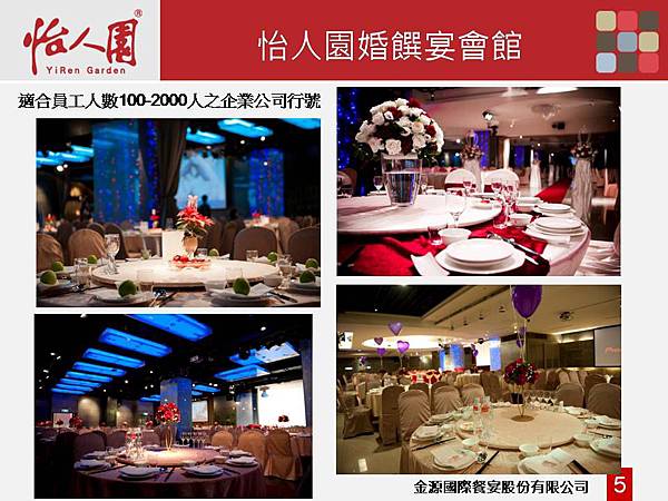 若是您的人數在100人以上,則可以選擇怡人園位於民權路上的婚饌宴會館,全廳打通最大容量可以到1500人,若分層舉辦可到2050人次喔(可視訊連線)!