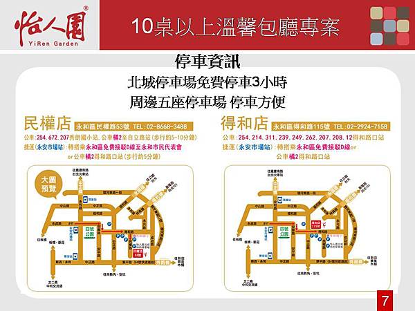 A10:捷運永安市場站出站後可搭乘D線接駁車(15-20分鐘一班)到市民代表會下車,對面就是怡人園婚饌宴會館了,也可搭乘橘2線到市民代表會喔!怡人園精緻餐敘館則搭乘到得和路口就可以看見了。