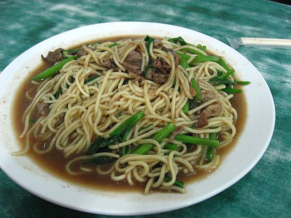 今天一同晚餐的還有即將要去韓國晚耍的 - 凱妹, 因此我們就多點幾道, 一起 SHARE~ 首先我們點了羊肉炒麵 NTD85, 沙茶口味的, 理當加個空心菜才對味~ 說實話.....如果大家吃慣 "牛肉沙茶炒麵"的口感, 這羊肉炒麵就是這樣的味兒, 沒啥創新的感覺~ 麵就是一般油麵的麵條~ 是熱炒店都會拿來使用的材料!!! ( 不然你是以為你在吃法國菜嗎?? )