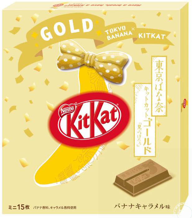 『東京芭娜娜 KITKAT GOLD「找到啦!」焦糖香蕉口味』於口感滑順的香蕉風味白巧克力中加入焦糖粉,使東京芭娜娜柔和的蕉香中增添了焦糖的香氣,巧克力外觀則呈現黃金般的色澤;金色的包裝上也印著大大的「GOLD」字樣,非常適合當作加油小道具,為努力爭取好成積的選手們獻上鼓勵與祝福。