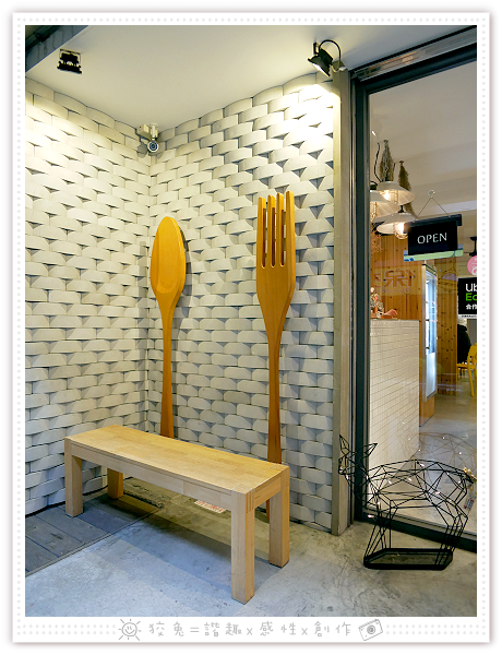 門口的裝置藝術超吸睛!可愛的木匙、木叉,搭配遠看好像籐編效果的背景牆,建構出輕鬆的野餐fu!絕佳的網美拍照打卡地點!