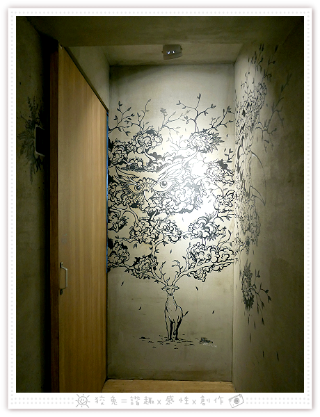 洗手間外面的壁畫設計好唯美,依稀從中看到麋鹿和貓頭鷹等動物?