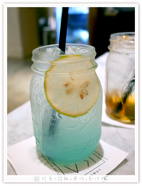 套餐附搭120元飲品(瓶裝酒不適用),超過補差額即可!第一杯選了含微量酒精的氣泡飲,呈現療癒的海洋藍色,彈珠汽水風味,酒感不顯著,輕甜爽口!