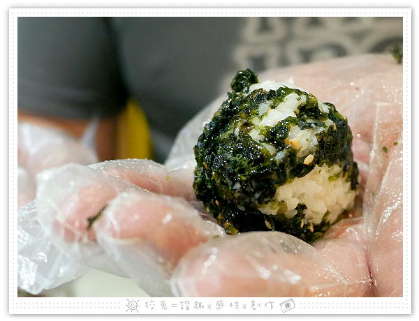 為了不然小叮噹滑手機滑到手抽筋,我叫他伸出圓手,捏飯糰活動一下!狡兔本身就是美乃滋控、嗜甜的台南人,這飯糰果然很對味!