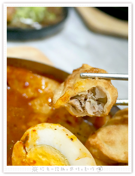 裡面還藏有一顆水煮蛋喔!至於炸過的餃子,內餡是高麗菜豬肉,不沾醬直接吃就相當夠味了!