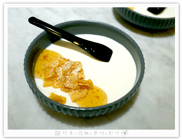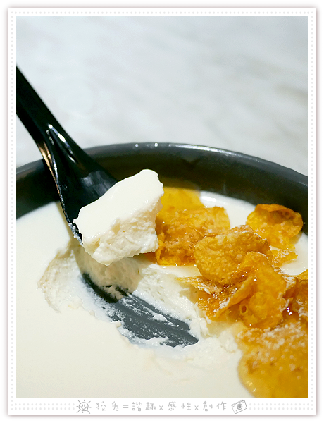 餐後甜點隨機供應,我們遇見起司豆腐,綴以玉米脆片、柚子醬。