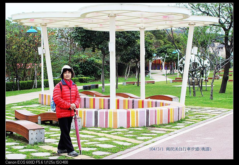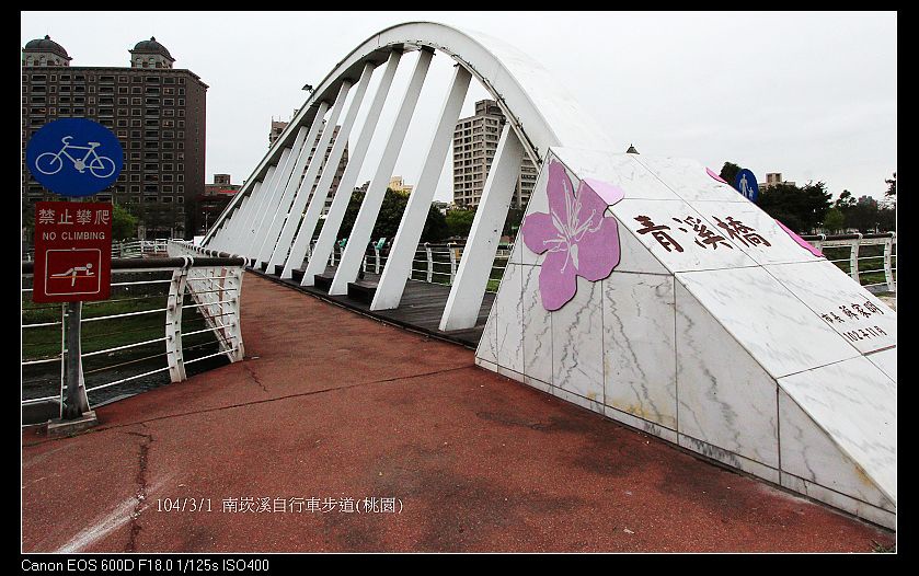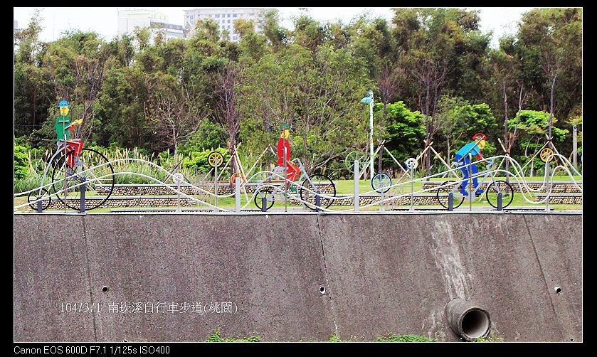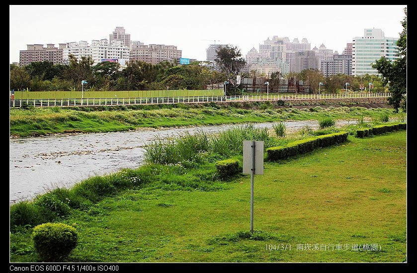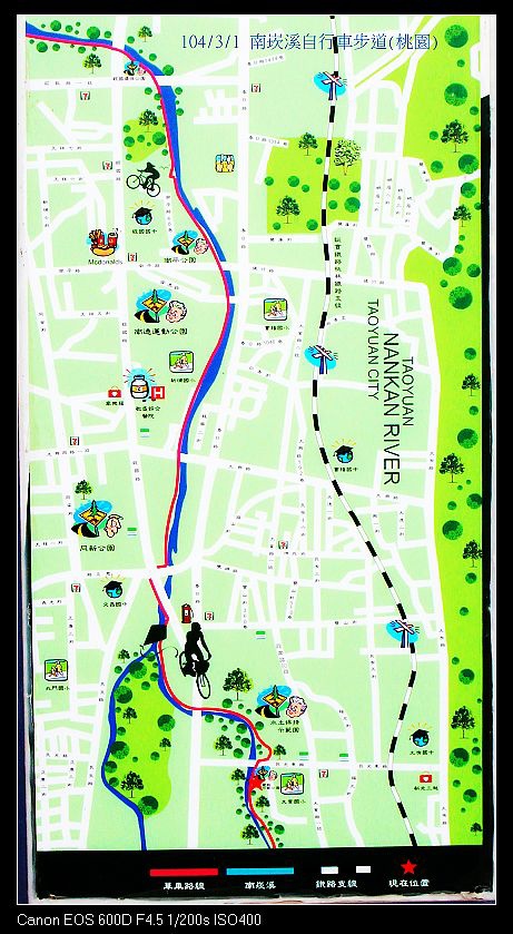 南崁溪自行車道~是桃園縣第一條水岸專門自行車步道,由龜山鄉中正公園 經精忠橋頭進入,經過龜山第一河濱公園、桃園市水岸自行車道、蘆竹鄉第一河濱公園,再越過溪底橋來到蘆竹光明河濱公園,全長約15公里。於98//11/29串聯通車啟用。